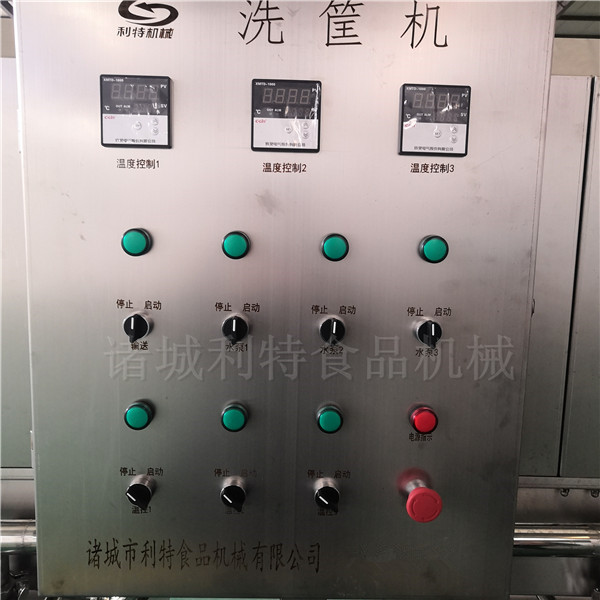 一人將臟污的筐子倒扣放置在清洗機(jī)的傳送鏈條上,鏈條的傳動帶動箱子進(jìn)入清洗區(qū)域,經(jīng)過預(yù)洗段、主洗段、漂洗段、凈水沖洗段對筐子進(jìn)行全部的高溫滅菌高壓清洗處理,電機(jī)帶動鏈條向出口處傳輸,操作人員將箱子從清洗機(jī)上取出從而完成洗箱操作。 兩人操作即可完成清洗工作。