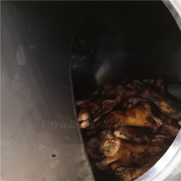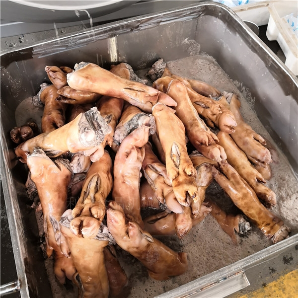 經(jīng)過真空滾揉機腌制后,原料現(xiàn)在是在規(guī)定的時間內(nèi)腌制完畢,將腌制后的豬爪用料車接下