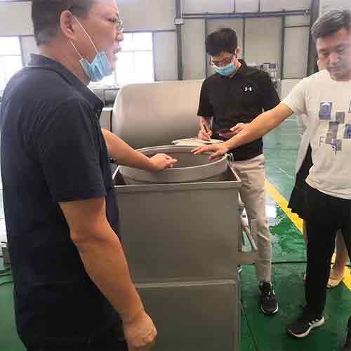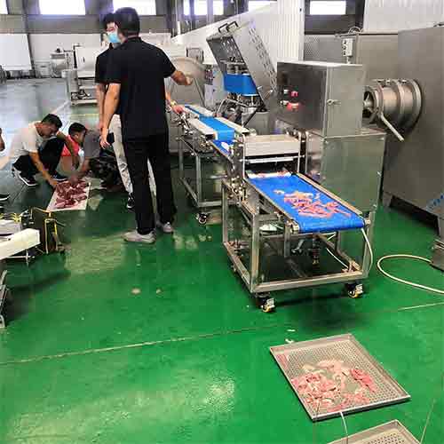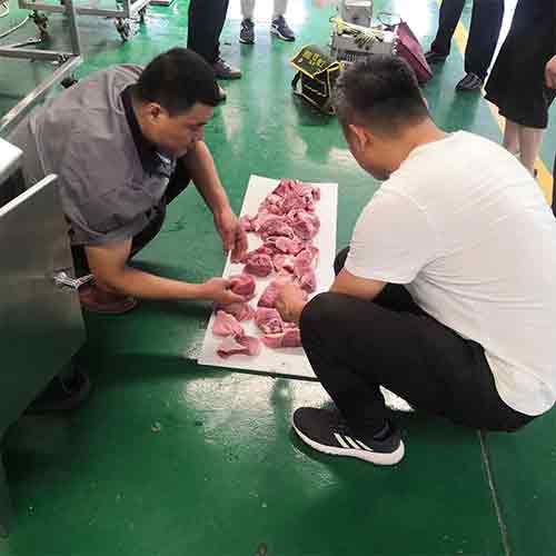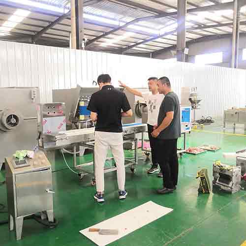 小酥肉是一款較火的肉食品,近期客戶前來考察小酥肉設(shè)備也是挺多的,這不今天客戶來公司現(xiàn)場(chǎng)試機(jī)新鮮豬肉的切割腌制以及相關(guān)的加工設(shè)備,我們?yōu)榇颂峁┝藵L揉機(jī)、鮮肉切片切條機(jī)、打漿機(jī)等