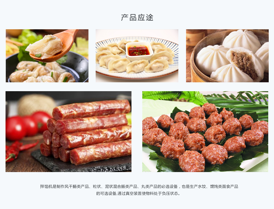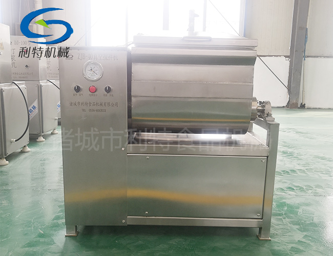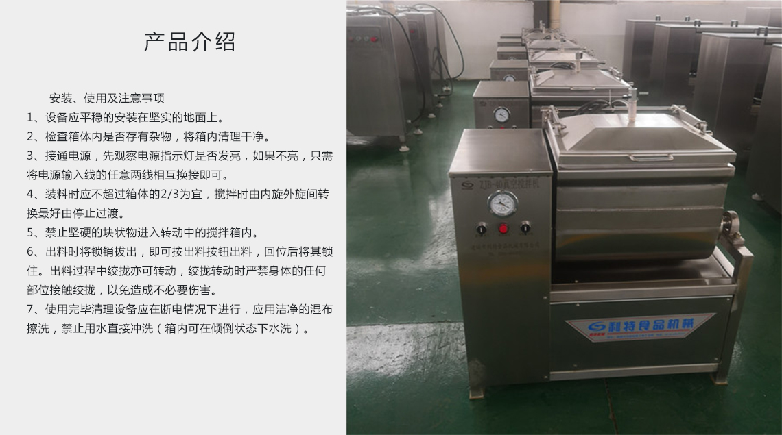 產(chǎn)品規(guī)格:ZBX-40/ZBX-350/ZBX-750/ZBX-1200/在真空狀態(tài)下物料攪拌均勻、充分膨脹、無氣泡、彈性好、色澤鮮艷并能夠提取蛋白質(zhì),混料效率高,是改善產(chǎn)品品質(zhì)的一款必備設(shè)備。是制作風干腸類產(chǎn)品、粒狀、泥狀混合腸類產(chǎn)品,丸類產(chǎn)品的主要設(shè)備,同時也是生產(chǎn)水餃、餛飩類面食產(chǎn)品的可選設(shè)備。