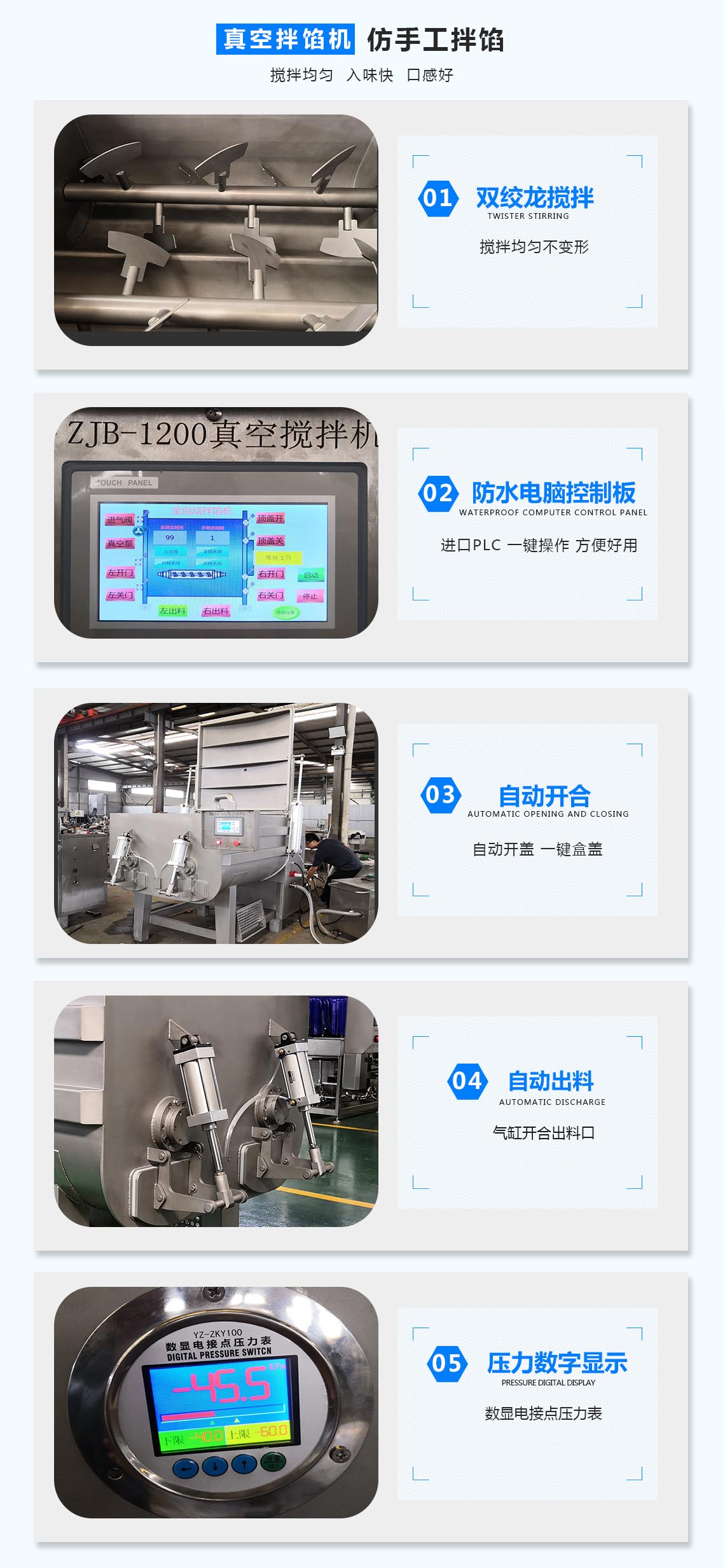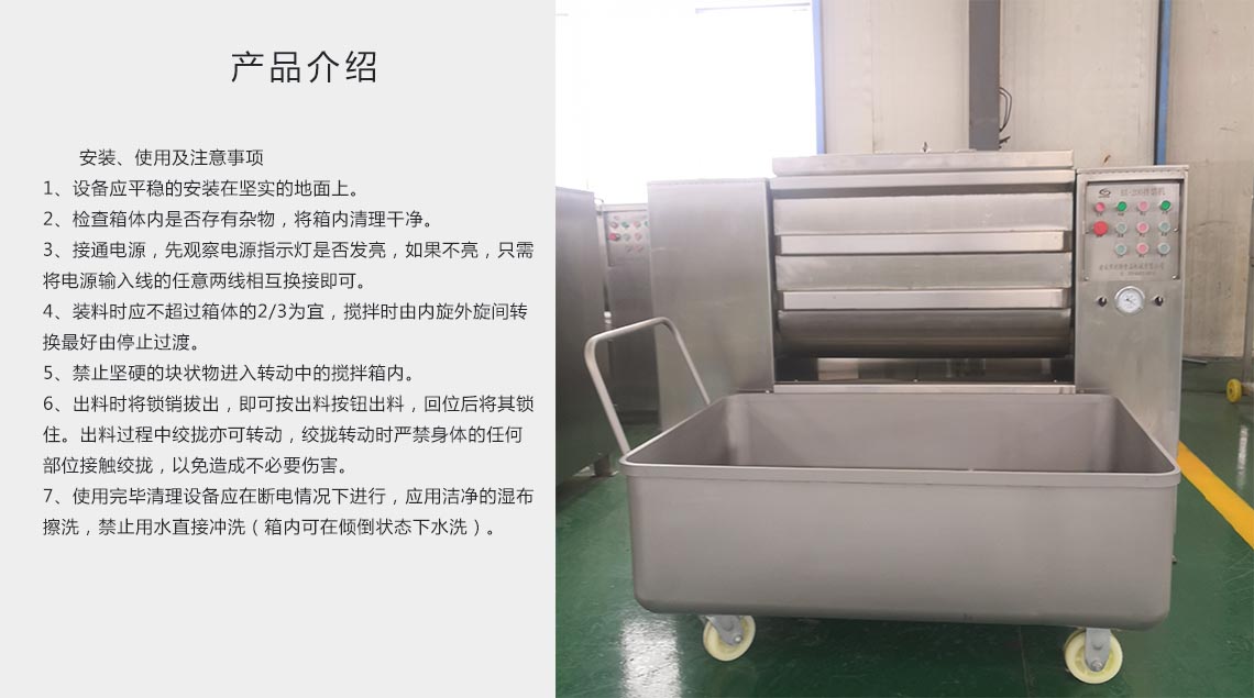 在真空狀態(tài)下物料攪拌均勻、充分膨脹、無氣泡、彈性好、色澤鮮艷并能夠提取蛋白質(zhì),混料效率高,是改善產(chǎn)品品質(zhì)的一款必備設(shè)備。是制作風(fēng)干腸類產(chǎn)品、粒狀、泥狀混合腸類產(chǎn)品,丸類產(chǎn)品的主要設(shè)備,同時(shí)也是生產(chǎn)水餃、餛飩類面食產(chǎn)品的可選設(shè)備。